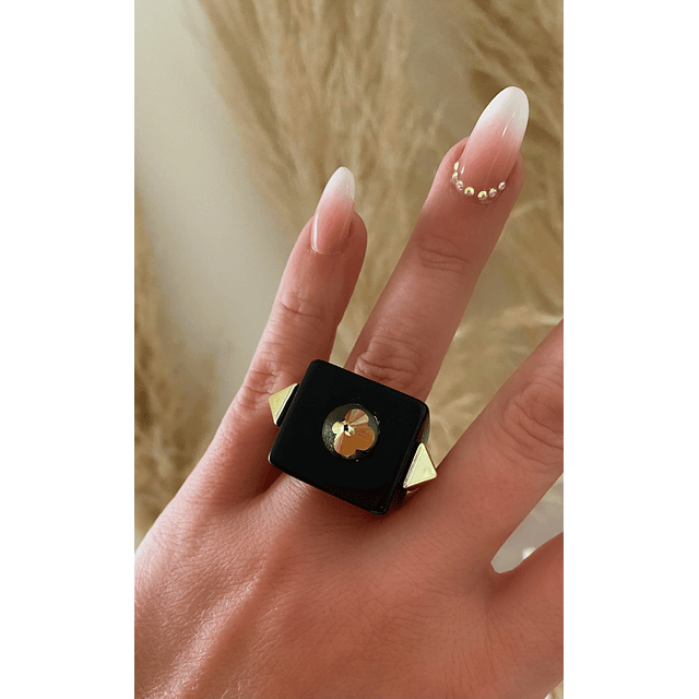 Anillo elaborado en resina resiste negra , con aplicaciones de tachas en el centro y tambien en laterales