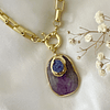 Tiene un Dije móvil de Amatista pulida con reborde enchape oro y drusa de cuarzo amatista central