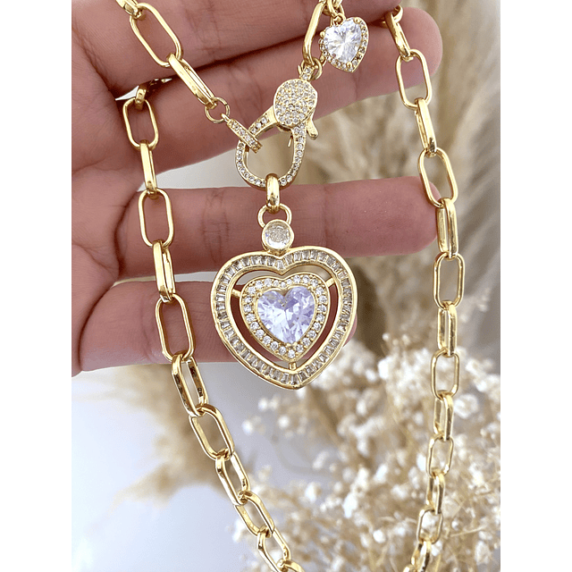 Diseño exclusivo y precioso de maxi Eslabones tradicionales con dije de Corazón con cristales y circones, con hermoso broche de circones y punto de luz corazón